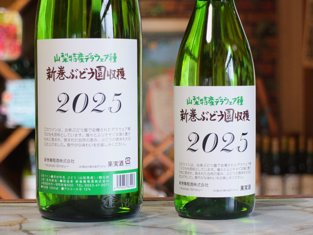 10月3日より「2025新巻ワイン(デラウェア)」発売です。今年は異例の暑さに加えて、ブドウに熟度をもたらした乾燥した年となりました。普段と違った厚みのある果実感たっぷりな辛口デラウェアワインをお楽しみいただけます。今年は一升瓶も通常販売しております。